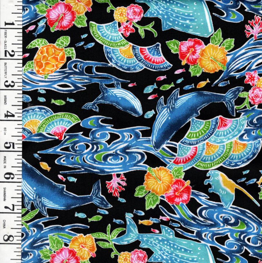 This pretty fabric in the style of Okinawa Bingata, features an underwater scene with whales, small turtles, and pretty hibiscus flowers. No metallic.