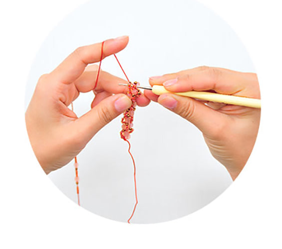 The length of the body of the hook allows the users' finger to reach the hook tip, so that the user can crochet smoothly while pulling down a bead.