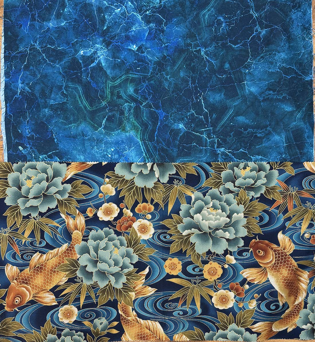 This package includes two pieces. From the Kona Bay archives, a 1/3 yard piece with golden koi, teal blue peonies and blue river swirls. From Northcott fabrics, a coordinating 1/2 yard piece from their rockery collection.