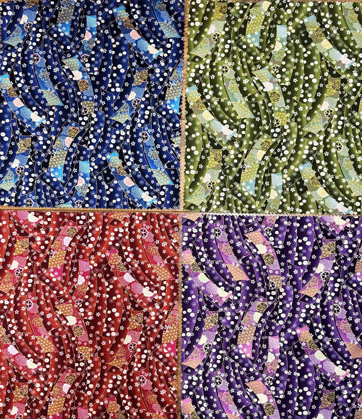 From Notions in Paradise, this sampler features 4 - 10" x 11" pieces with colorful noshi ribbons. Gold metallic accents and the pieces have pinked edges.