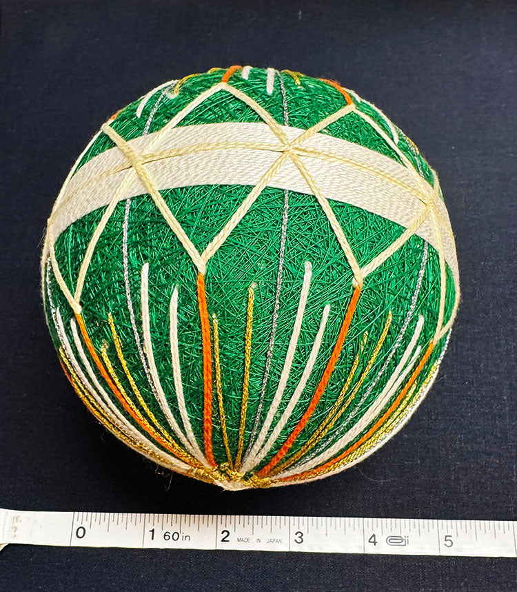From Japan, this large size temari ball dates back to pre 1970's. In excellent condition, it is made with green, cream, and orange threads with gold metallic accent threads. Fiber content unknown.