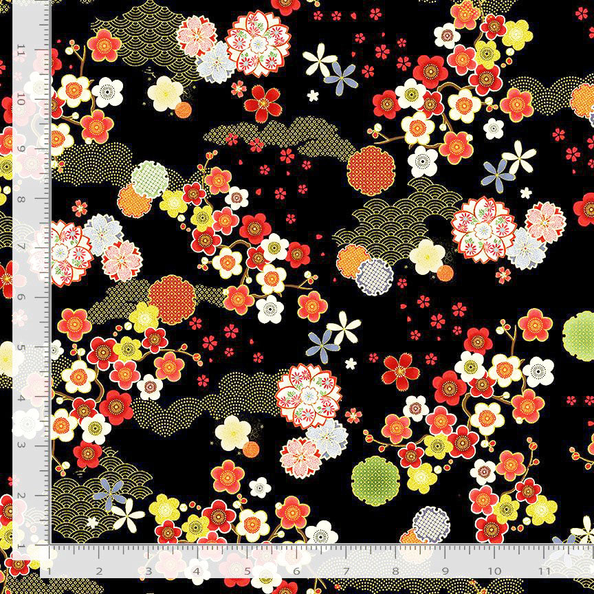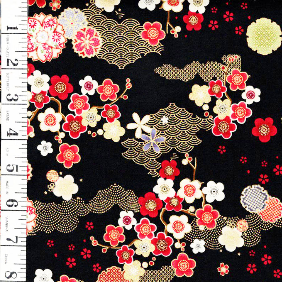 From Timeless Treasures' Lotus Garden collection, this pretty fabric features small floating blossoms and floral medallions. A traditional wave motif in gold metallic decorates the background.