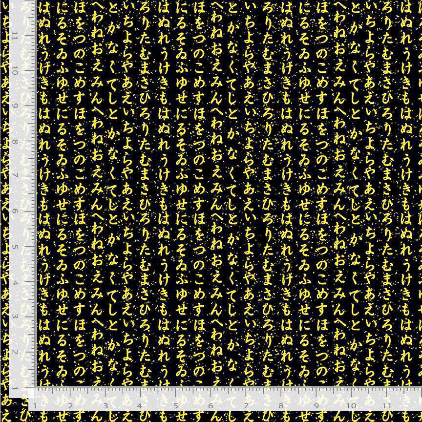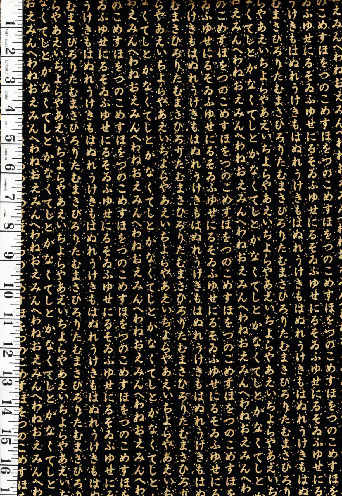 From Timeless Treasures' Lotus Garden collection, this fabric features columns of small gold metallic abstract kanji.