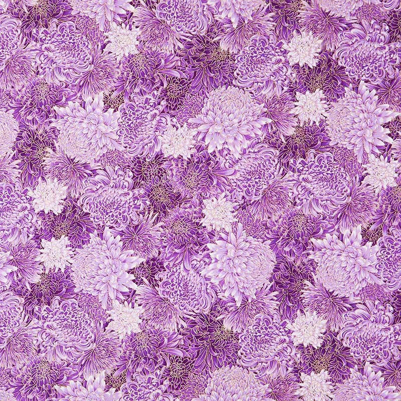 From Timeless Treasures, this pretty fabric features a compact design of chrysanthemums in lavender and purple.  Gold metallic accents.