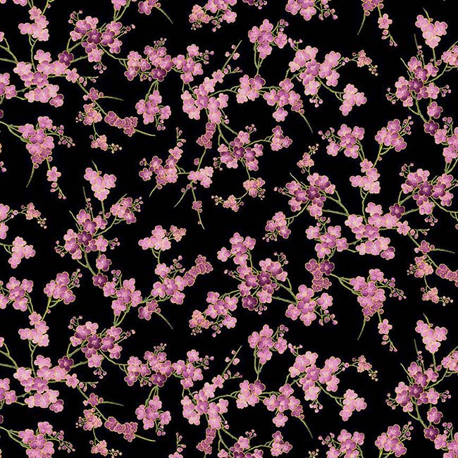 From Timeless Treasures, this pretty fabric features a delicate design of small pink cherry blossom branches on a rich black background. Gold metallic accents.